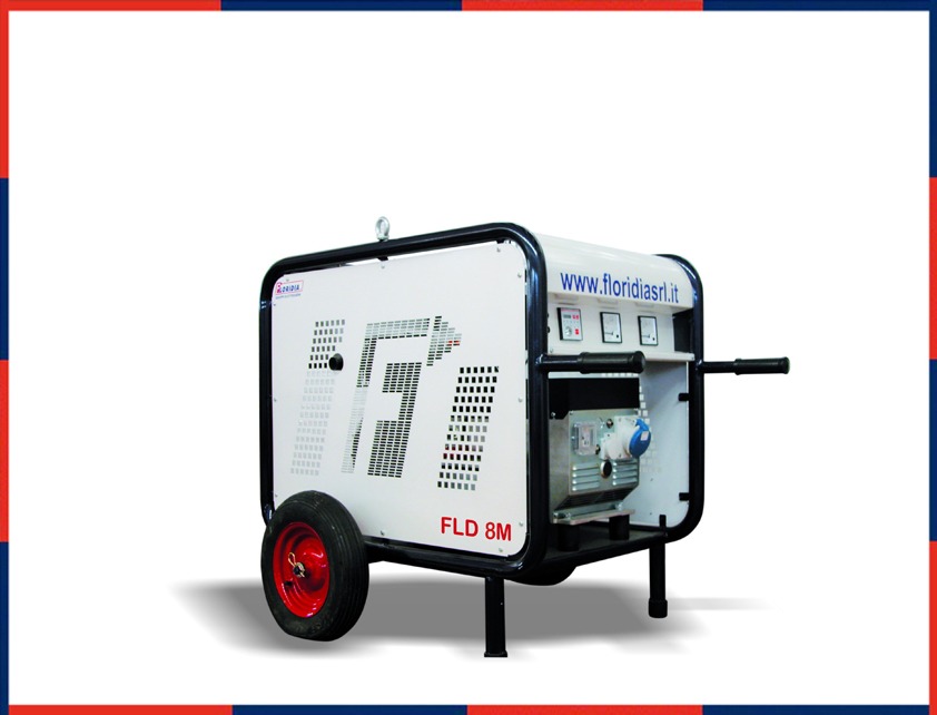Diesel engine driven generating set mounted on a electro welded steel base with anti vibration mounts, fuel tank incorporated, battery lodged in the base, equipped with manual control panel, voltmeter, magneto thermic switch and sockets.